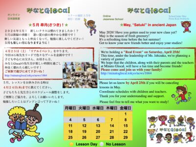 2026年5月! 新しいクラスは慣れてきましたか!? 5月は新緑の季節! 暑い夏の前の爽やかな季節です! 新しい友達ともっと仲良くなって、勉強に楽しんでください!5月も楽しい月になりますように! May 2026! […]