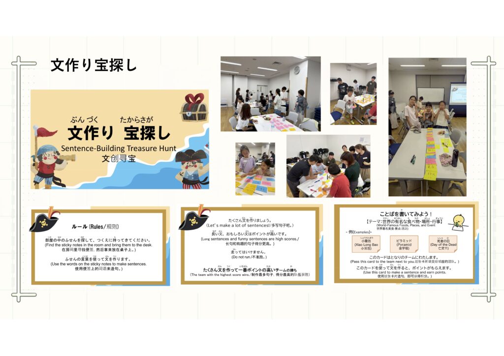 部屋中に貼ってあるいろいろな言葉を探し出して、チームでおもしろい文やなが~い文を作るなど、普段のレッスンで学んでいる日本語を活かして楽しむ姿が見られました。