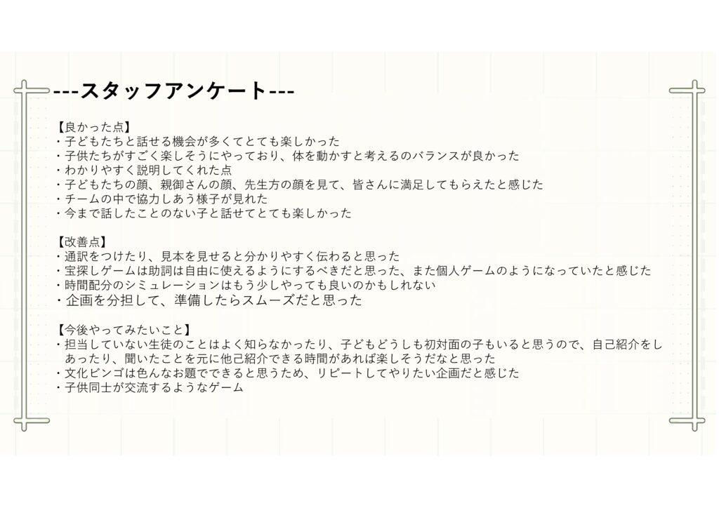 子どもたちの笑顔を見て、言葉や文化の違いをこえて、わかり合う楽しさを感じることができました。