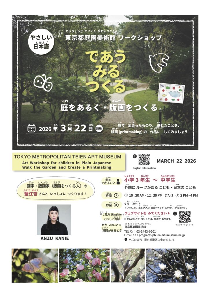 They're holding a workshop on Sunday, March 22nd, in the very large gardens of the "Tokyo Metropolitan Teien Art Museum", where participants will look at plants and small creatures and turn them into prints.